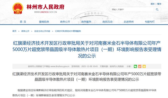 林州市人民政府对河南赛米金石半导体有限公司年产5000万片超宽禁带晶圆级半导体散热片项目(一期)环境影响报告表受理情况进行公示。